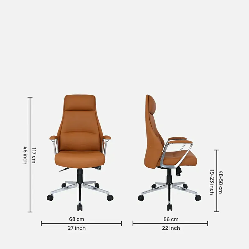 The Leatherette Executive Chair in Tan brings warmth, elegance, and professionalism to any workspace.Its premium tan leatherette upholstery adds a sophisticated touch while ensuring easy maintenance.Designed for comfort, it features a cushioned seat, supportive backrest, and padded armrests for long hours of use.The chair includes a 360° swivel base, smooth-rolling castors, tilt mechanism, and height adjustability.Built for both style and functionality, it fits perfectly in executive cabins or modern home offices.A perfect blend of aesthetics, durability, and ergonomic support.