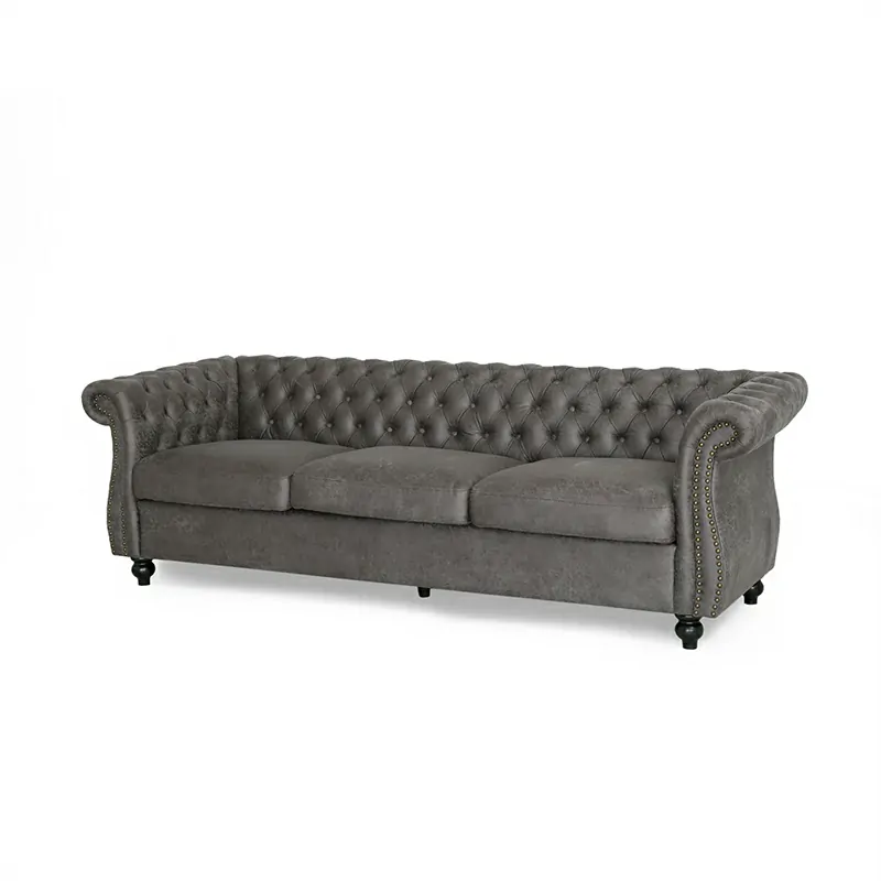 Design: Deep button tufting and rolled arms characteristic of Chesterfield style.
